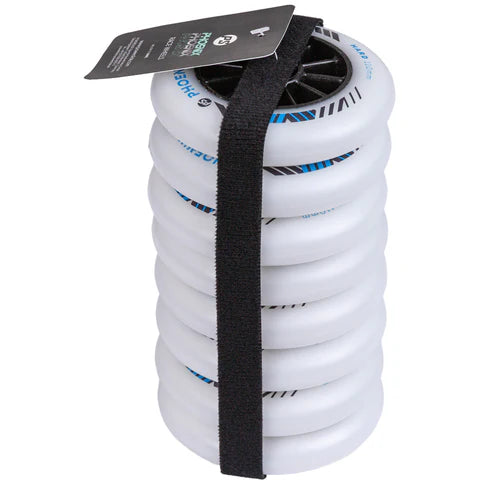 Phoenix Wheels Introducing the Powerslide Phoenix Wheels, engineered for competitive inline speed skaters seeking optimal performance. Available in 100mm, 110mm, and 125mm diameters, and in medium (~84A) and hard (~86A) hardness options, these wheels cater to various racing preferences. The Phoenix Wheels feature a dual-density polyurethane construction, with a softer inner layer that enhances grip and comfort by increasing the wheel's footprint during strides, and a harder outer layer that ensures maximum roll and speed. At the core is the optimized Phoenix race hub, designed to provide the perfect balance between flex and rigidity, offering responsive energy transfer and stability at high velocities. The hub's dome shape and small interlock design contribute to improved roll and consistent edge-to-edge transitions, crucial for competitive racing. Crafted with raw urethane sourced from France, both the polyurethane and the hub's injection materials are produced in France, ensuring premium quality. The final casting and processing occur in Germany, reflecting Powerslide's commitment to European manufacturing excellence. The round profile contact surface ensures smooth transitions and consistent performance, making the Phoenix Wheels an ideal choice for skaters aiming for podium finishes. This wheel is specifically designed for long-distance racing, providing endurance skaters with the grip, speed, and comfort they need to perform over extended efforts.