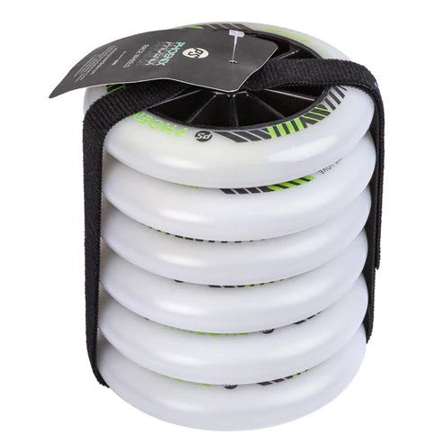 Phoenix Wheels Introducing the Powerslide Phoenix Wheels, engineered for competitive inline speed skaters seeking optimal performance. Available in 100mm, 110mm, and 125mm diameters, and in medium (~84A) and hard (~86A) hardness options, these wheels cater to various racing preferences. The Phoenix Wheels feature a dual-density polyurethane construction, with a softer inner layer that enhances grip and comfort by increasing the wheel's footprint during strides, and a harder outer layer that ensures maximum roll and speed. At the core is the optimized Phoenix race hub, designed to provide the perfect balance between flex and rigidity, offering responsive energy transfer and stability at high velocities. The hub's dome shape and small interlock design contribute to improved roll and consistent edge-to-edge transitions, crucial for competitive racing. Crafted with raw urethane sourced from France, both the polyurethane and the hub's injection materials are produced in France, ensuring premium quality. The final casting and processing occur in Germany, reflecting Powerslide's commitment to European manufacturing excellence. The round profile contact surface ensures smooth transitions and consistent performance, making the Phoenix Wheels an ideal choice for skaters aiming for podium finishes. This wheel is specifically designed for long-distance racing, providing endurance skaters with the grip, speed, and comfort they need to perform over extended efforts.